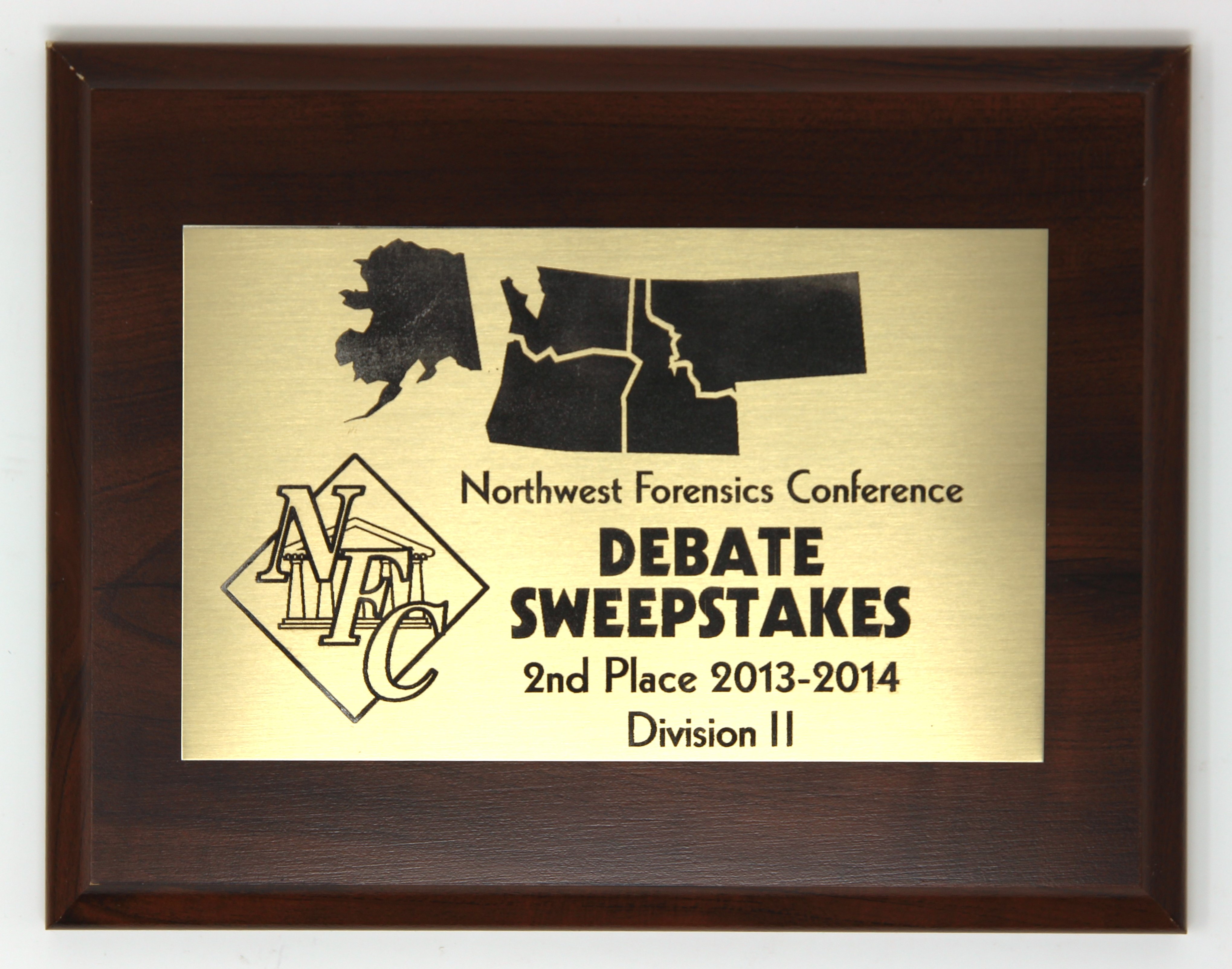Second place award in sweepstakes, second division, from the 2013 Northwest Forensics Conference.